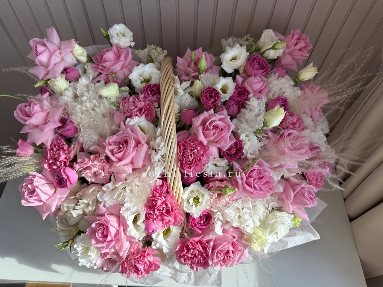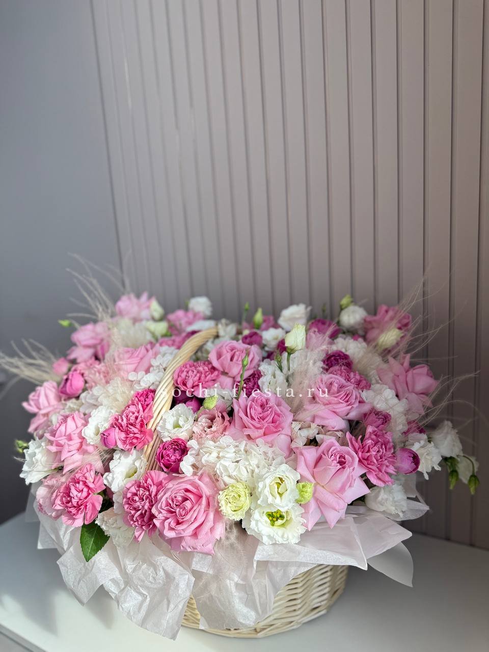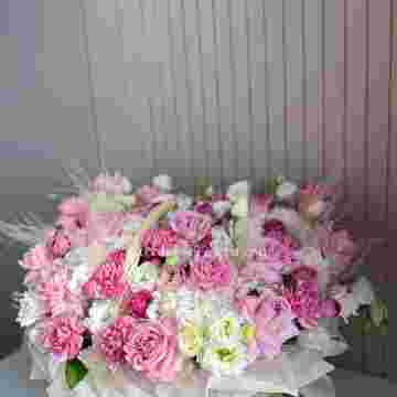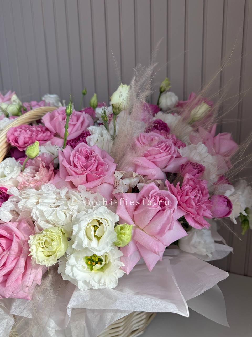 Состав: роза одноголовая, роза пионовидная, альстромерия, эустома, гортензия, ковыль, диантус, плетеная корзина