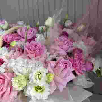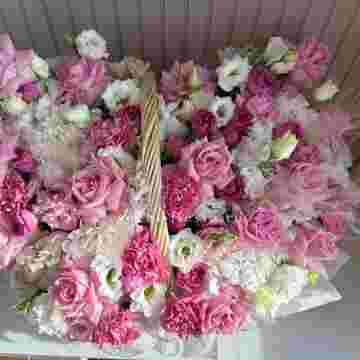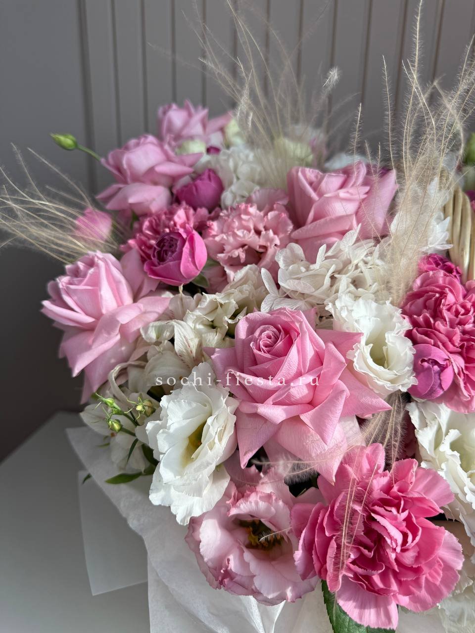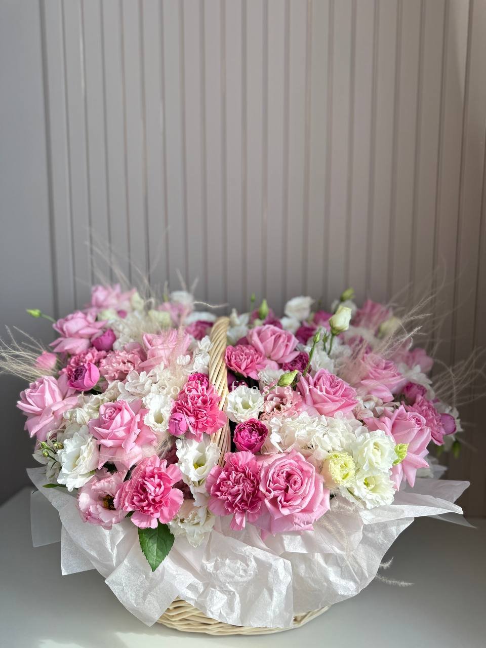 Состав: роза одноголовая, роза пионовидная, альстромерия, эустома, гортензия, ковыль, диантус, плетеная корзина