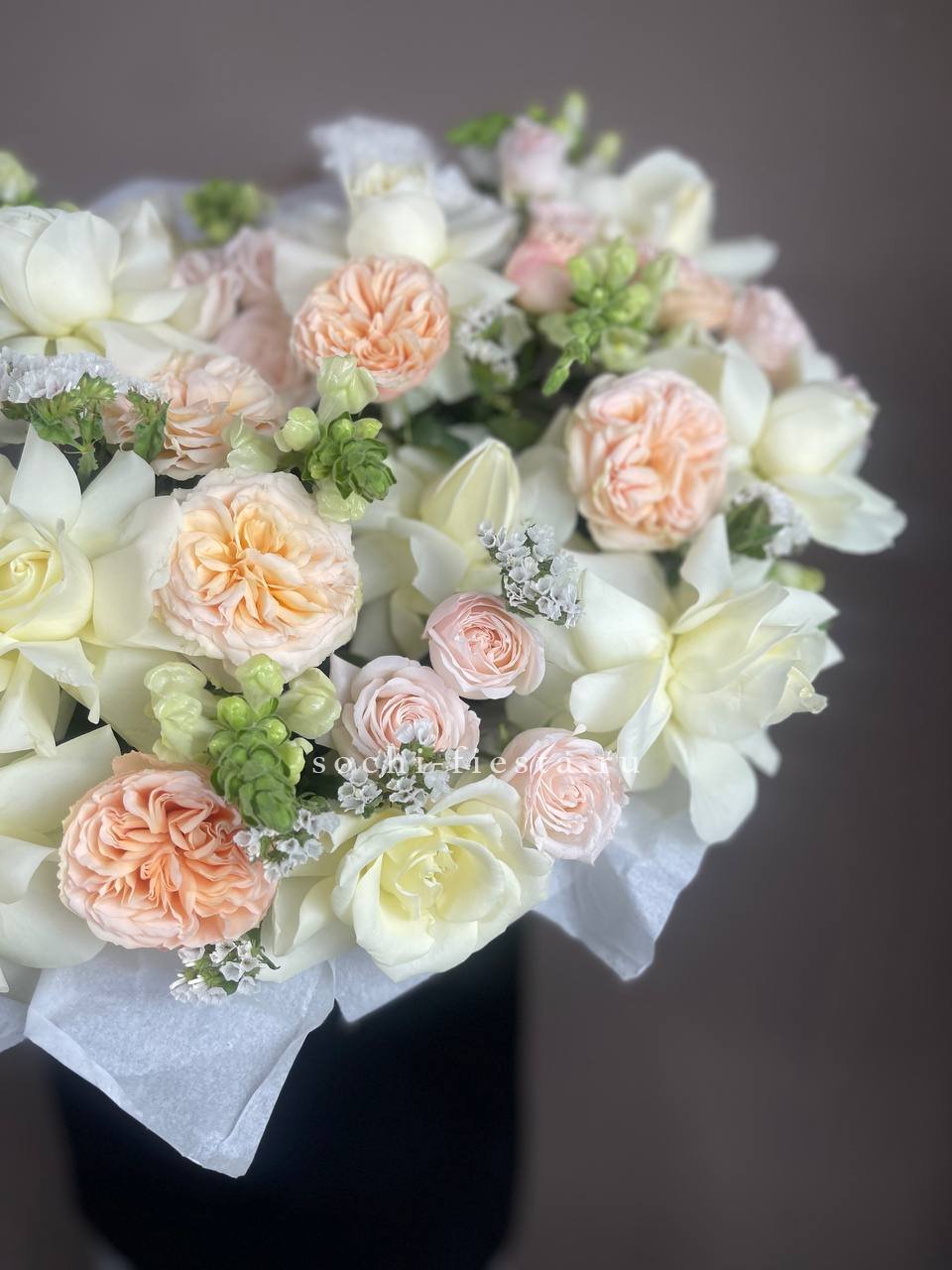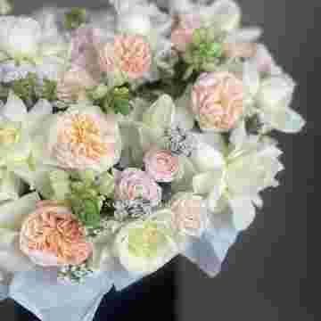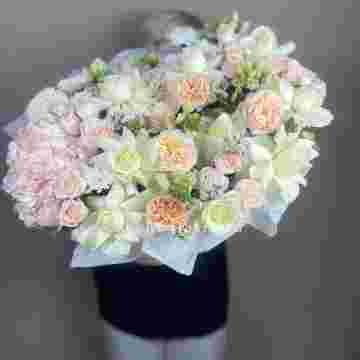 Состав: хризантема, кустовая роза, гортензия, белая роза, антиринум, статица, корзина средняя