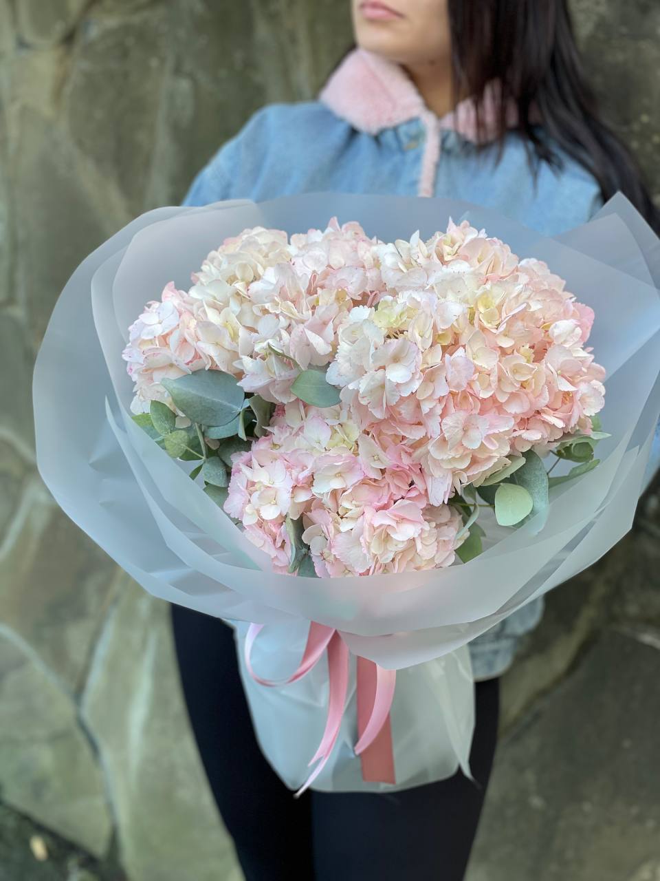 розовые гортензии, эвкалипт, пленка.