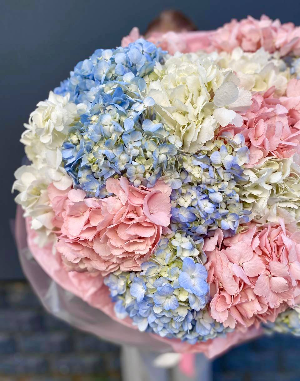 гортензия розовая 9шт., лента, дизайнерская упаковка. Цвет гортензий может незначительно отличаться.