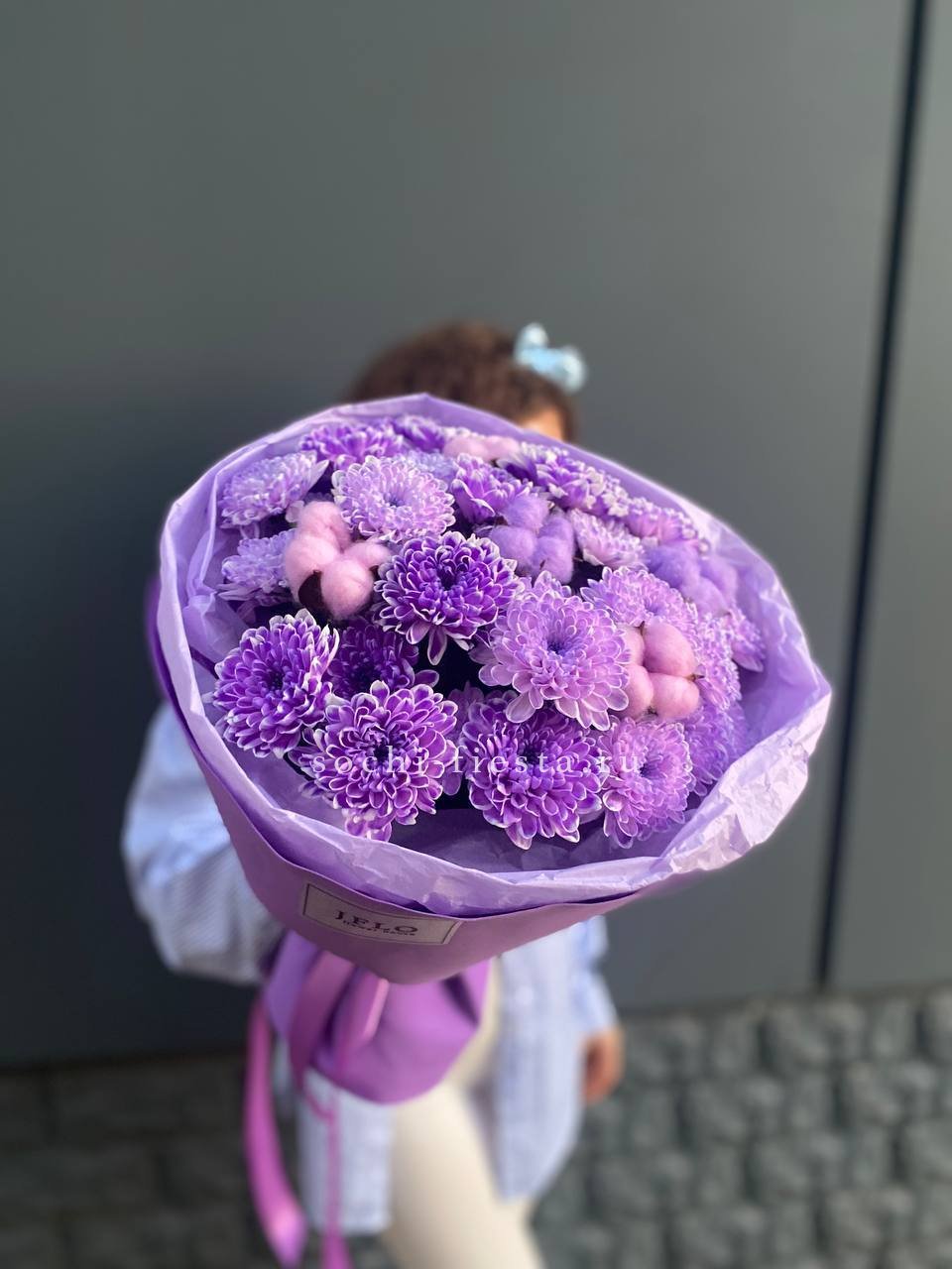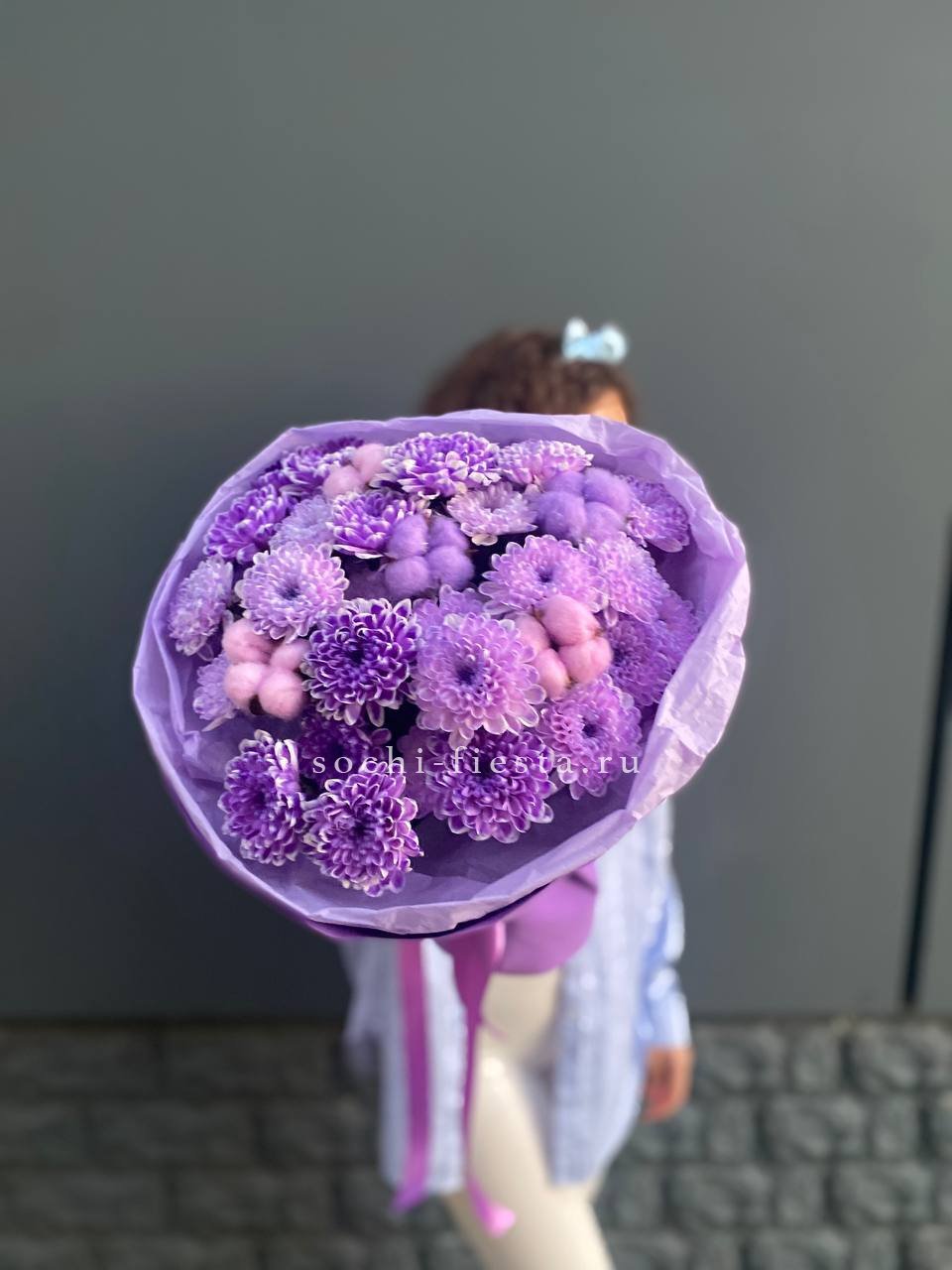 Состав: хризантема кустовая - 5шт., хлопок-5, оформление, лента