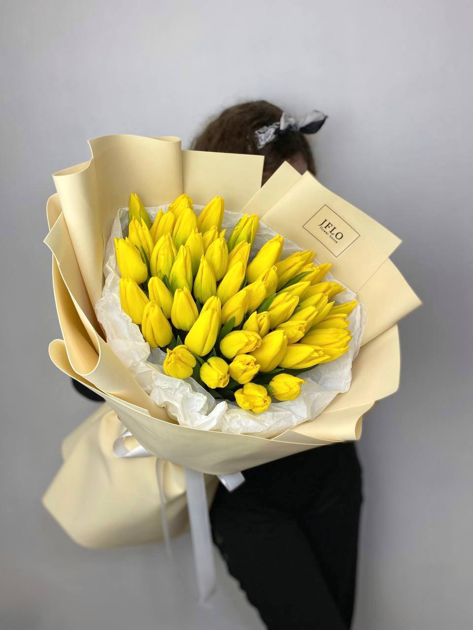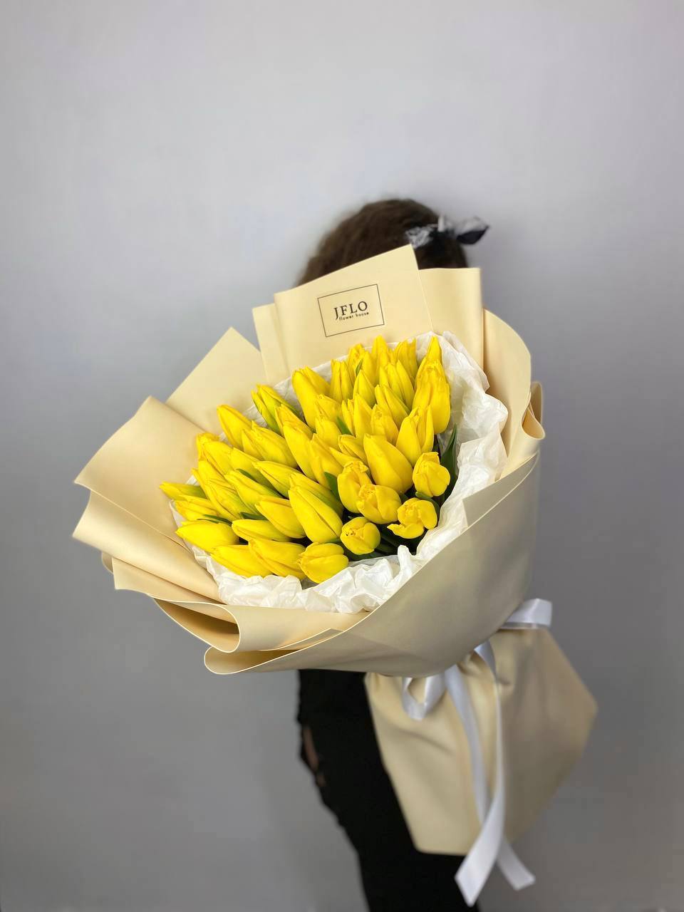 Двадцать пять алых тюльпанов выстроены в насыщенный монохромный букет. Красный цвет звучит уверенно и создаёт яркое впечатление с первого взгляда.