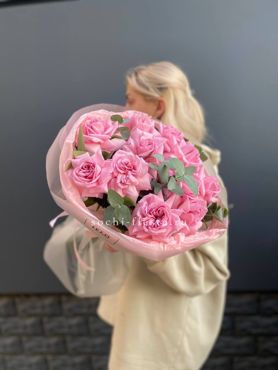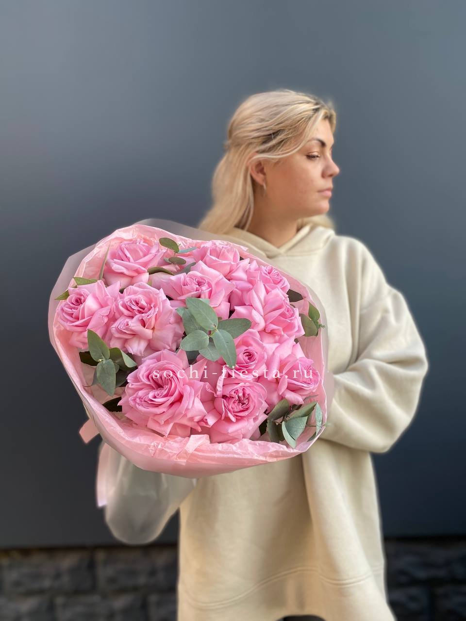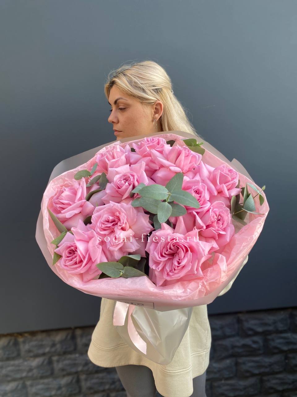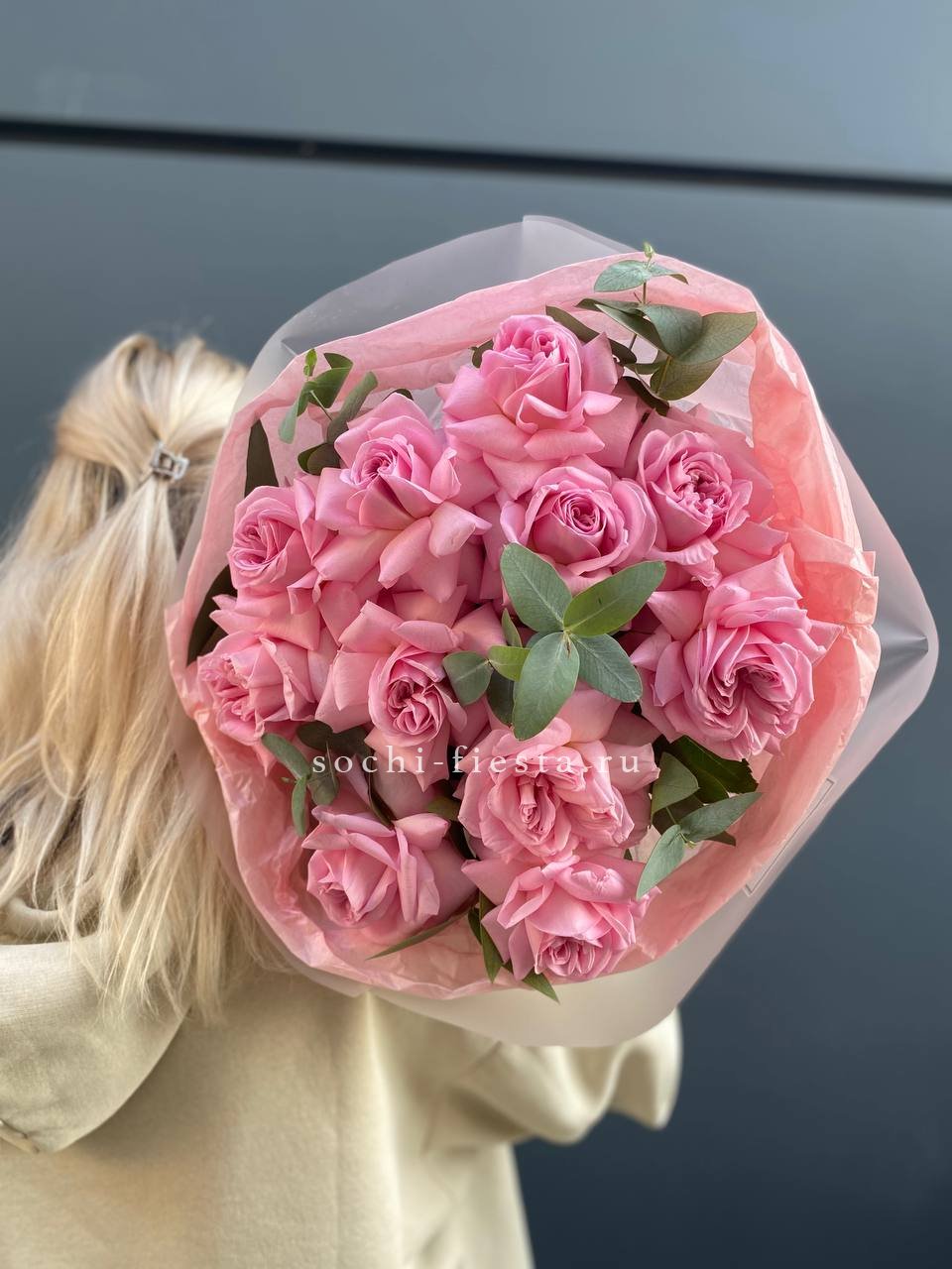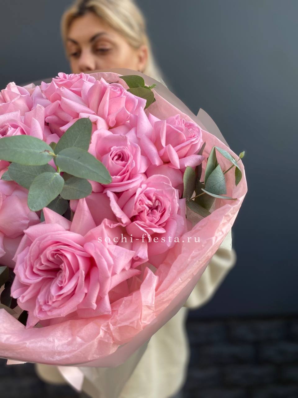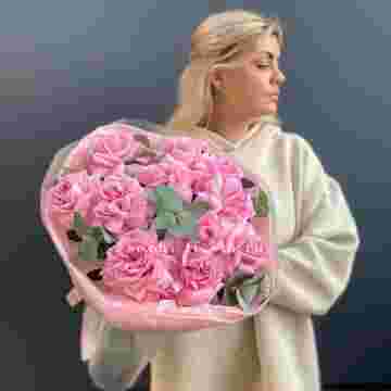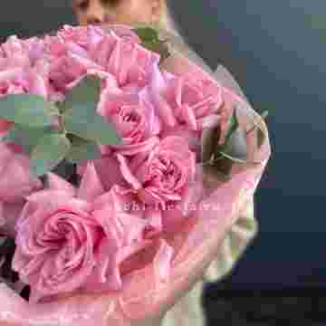 Состав букета на фотографии: вывернутые розы - 11 шт., эвкалипт-2шт, лента, авторская упаковка Для заказа товара нажмите в корзину