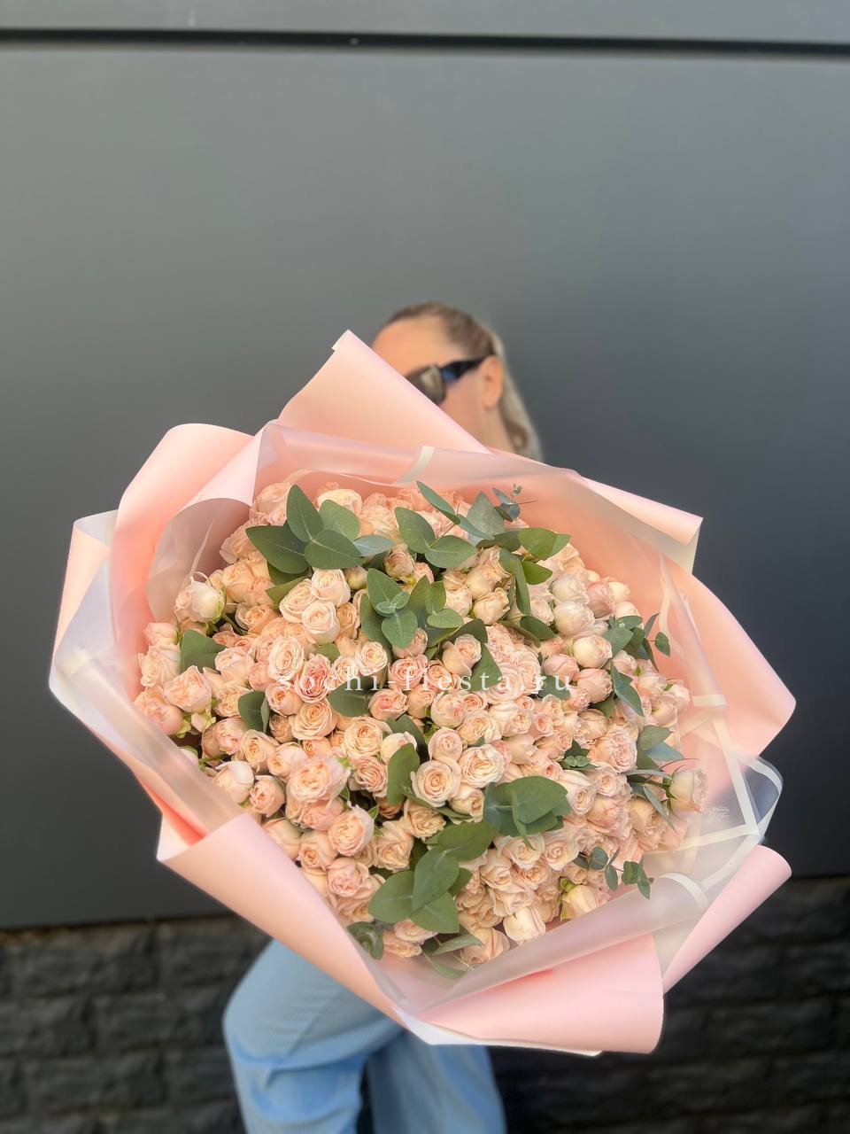Состав: 101 кремовая кустовая роза, эвкалипт, лента, дизайнерская упаковка