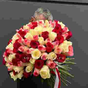 Состав: 101 роза разноцветных оттенков, лента, упаковка на выбор