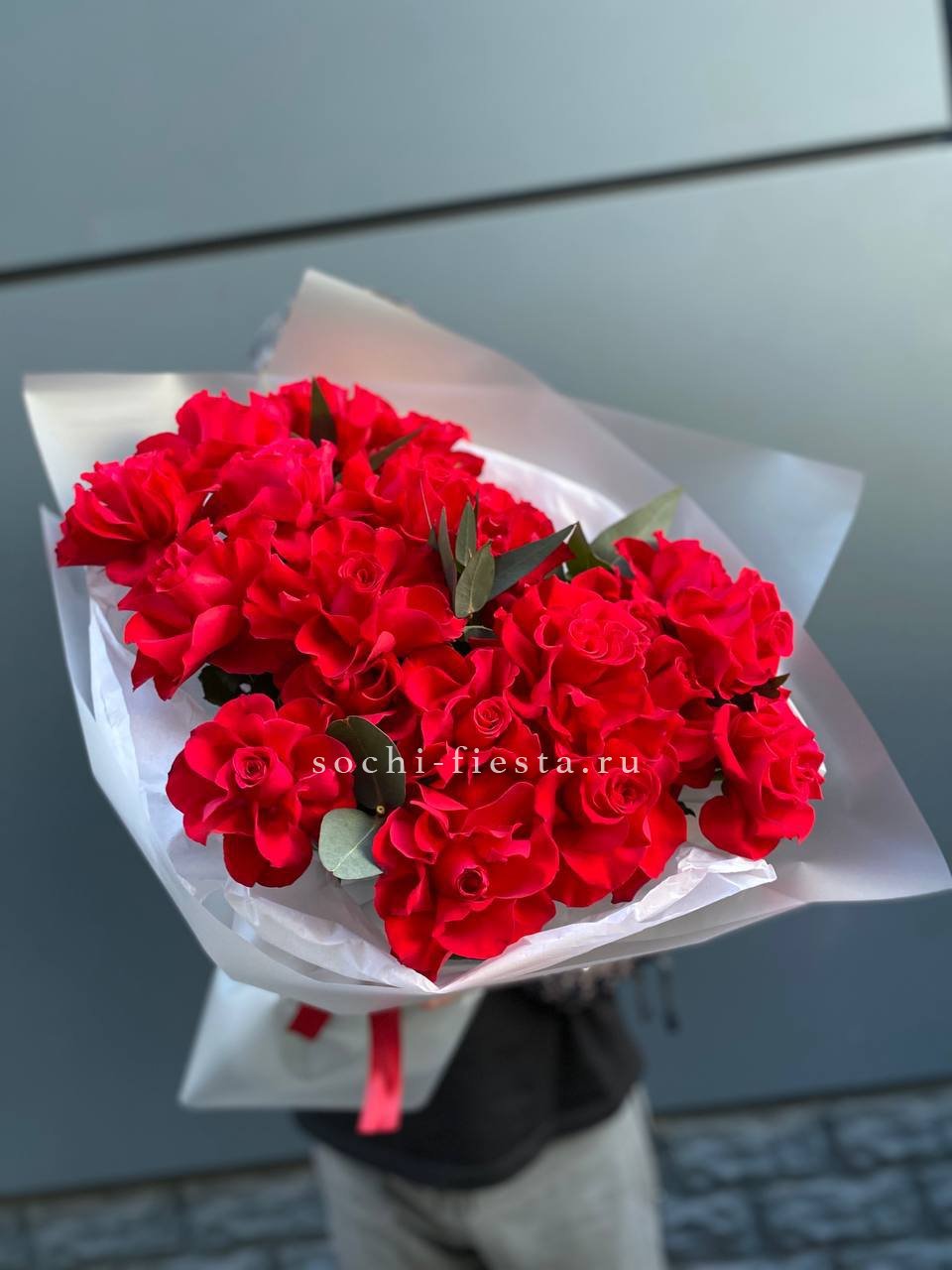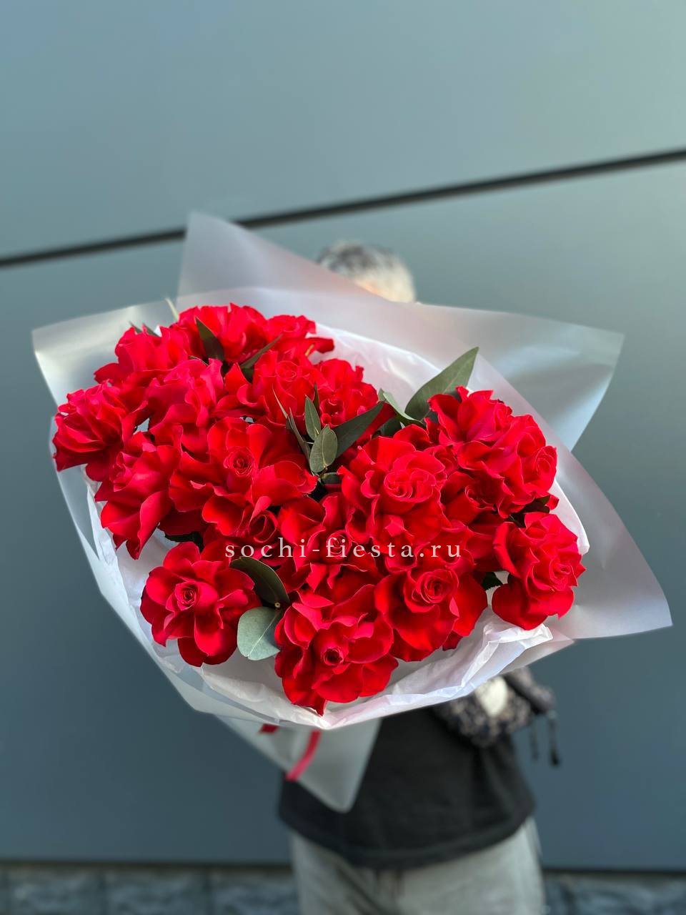 Состав: вывернутые розы - 21 шт., эвкалипт, лента, упаковка