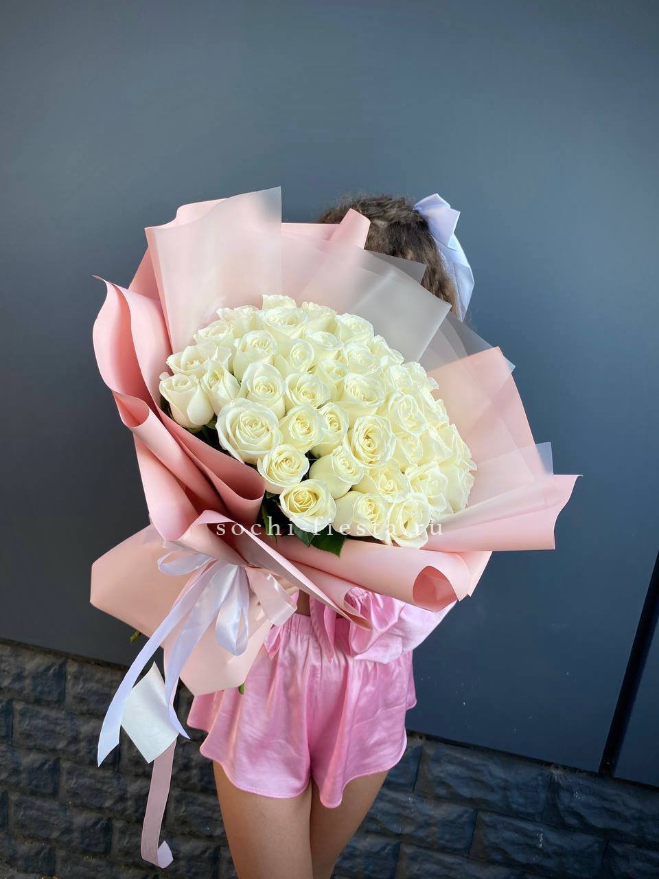 Состав: белые розы 35 шт., лента, упаковка на выбор