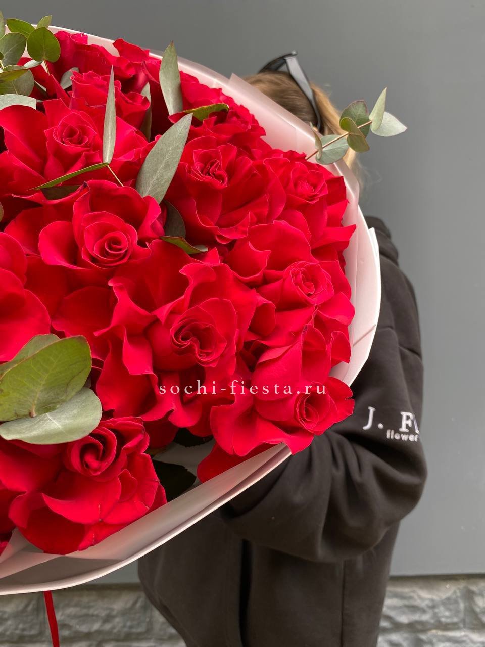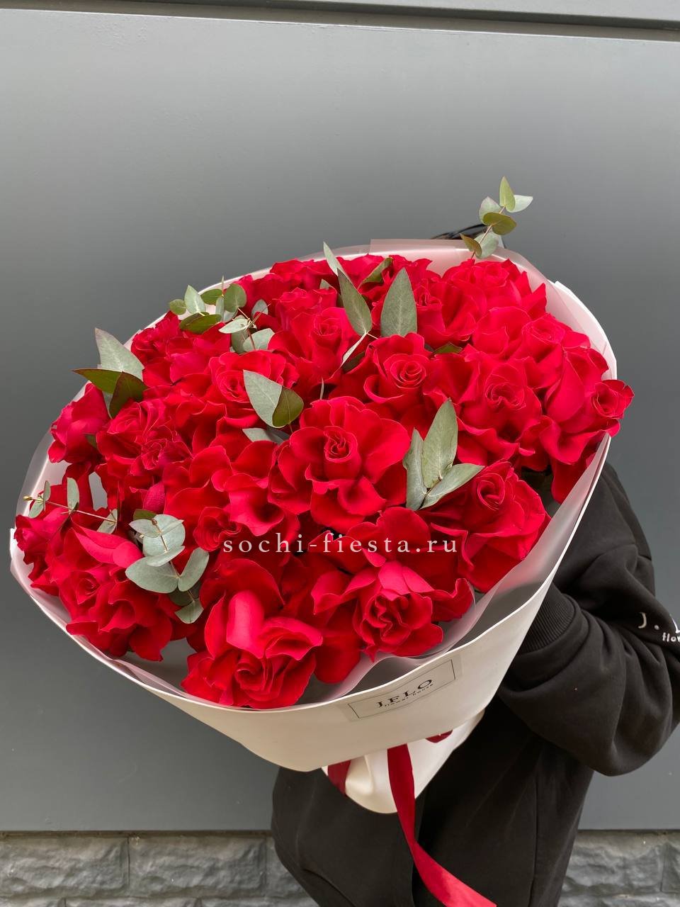 Состав букета на фотографии: французские розы - 23 шт., эвкалипт-3 шт, лента, авторская упаковка