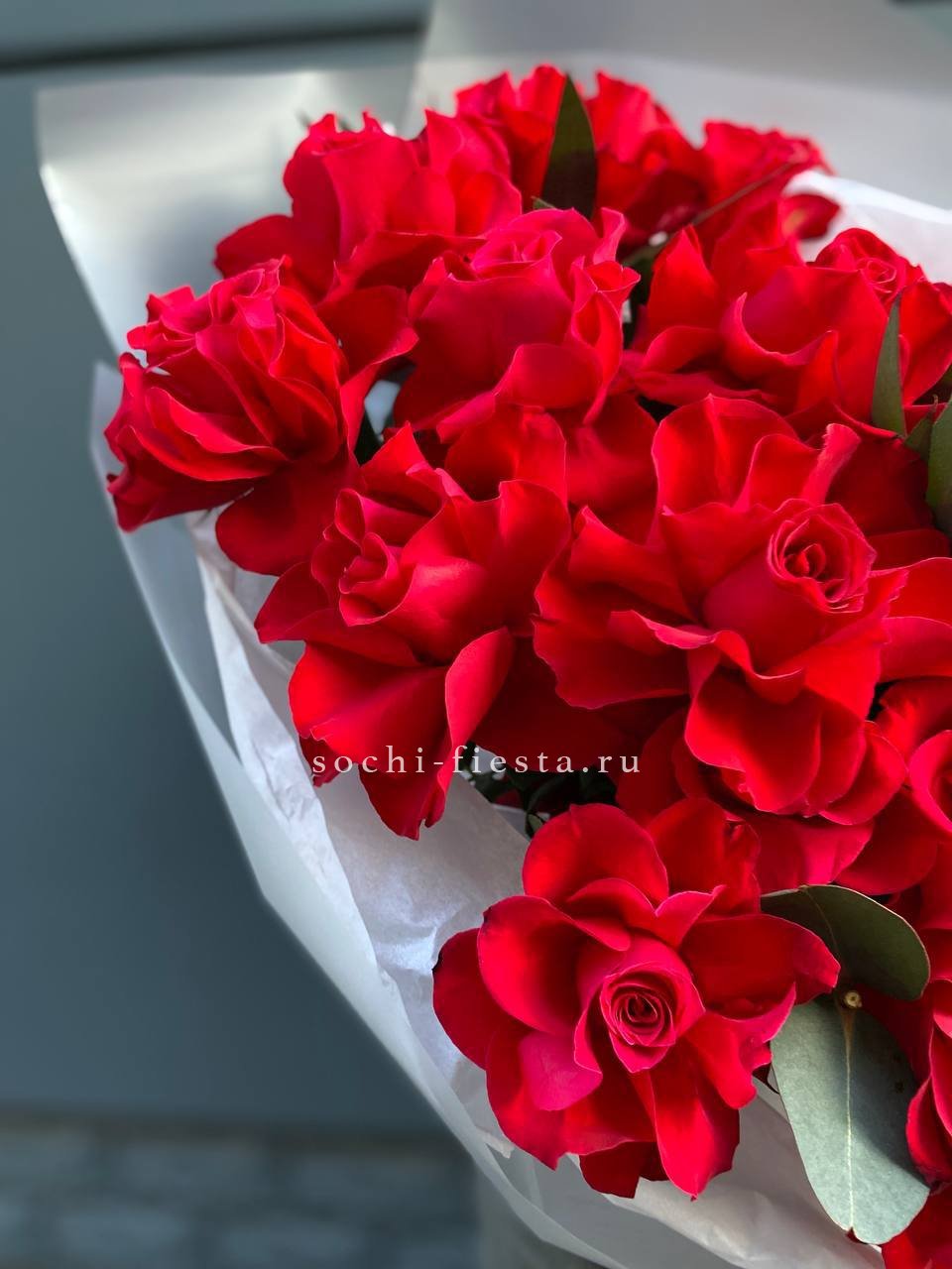 Состав букета на фотографии: вывернутые розы - 21 шт., эвкалипт-3 шт, лента, авторская упаковка