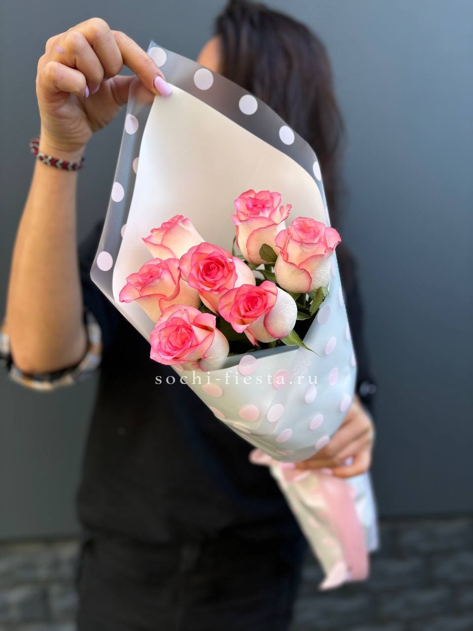 Состав: 7 роз сорта Джумилия, лента, дизайнерская упаковка
