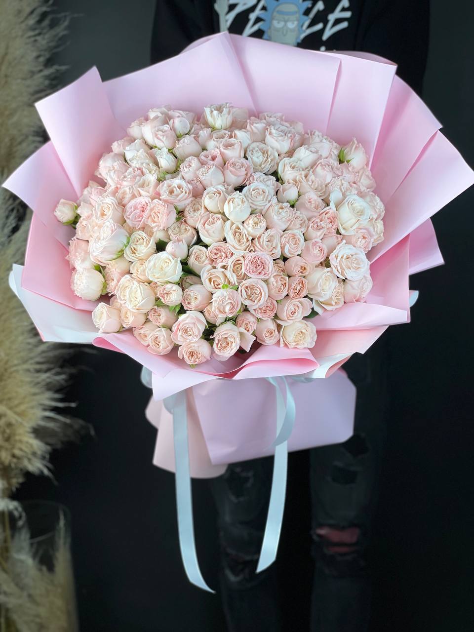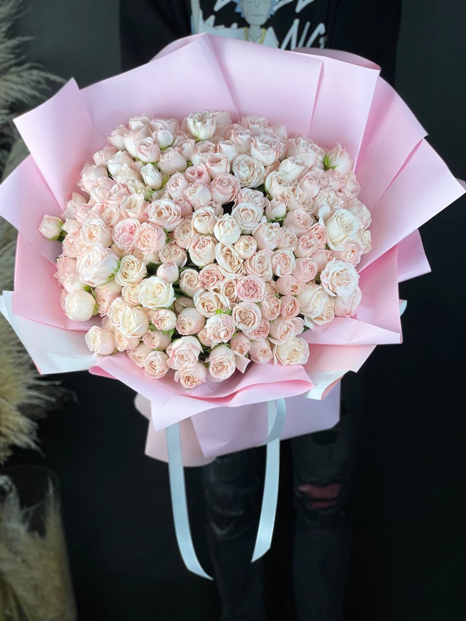 Сто одна белоснежная роза из Кении собрана в монохромную композицию с безупречной геометрией. Каждый бутон держит форму и создаёт плотное облако света. Для момента когда слова не нужны.